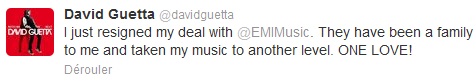 David Guetta a fait une petite boulette hier sur Twitter… Au lieu d’annoncer qu’il signait un nouveau contrat avec sa maison de disques EMI, il a malencontreusement affirmé le contraire…